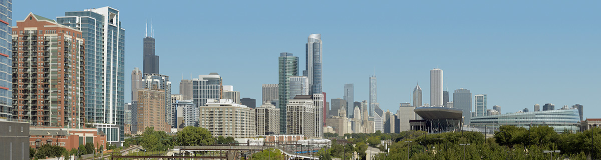 Keywords: Chicago city skyline Willis Tower The Sears Tower modern office commercial buildings Soldier Field day time