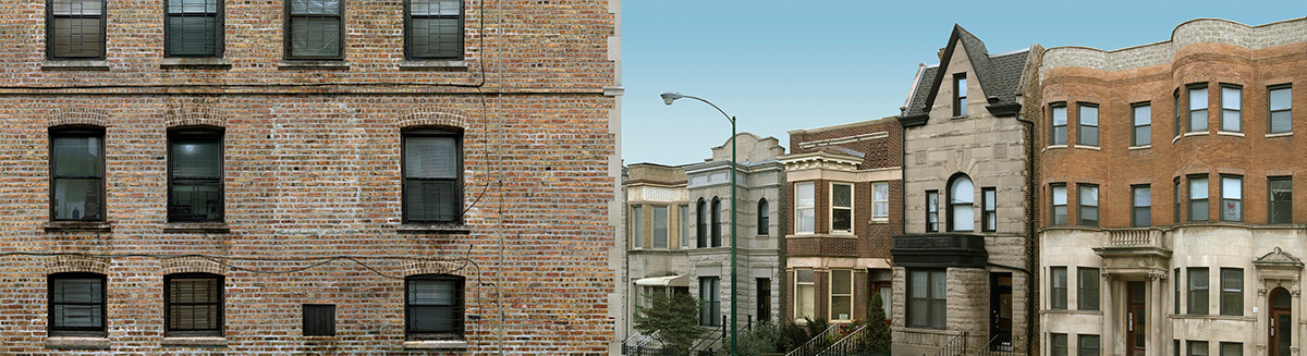 First floor view looking across the street at Row houses or apartment buildings with street perspective green bushes blue sky