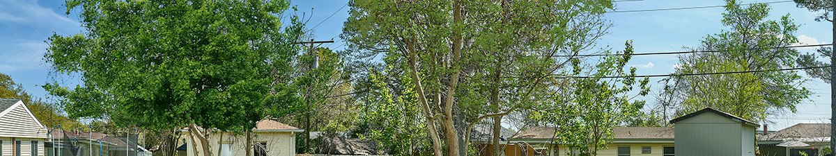 Keywords: day daytime residential backyard trees rooftops blue sky