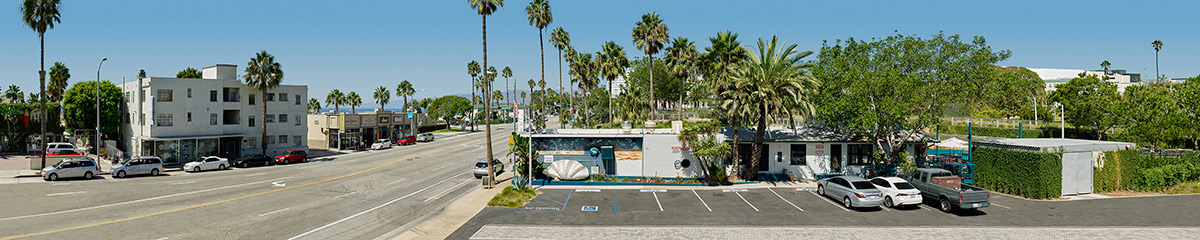 Keywords: day daytime Santa Monica street ocean blue sky green trees commercial buildings parking lot