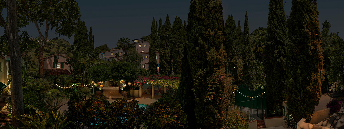 Keywords: day daytime apartment courtyard swimming pool green trees hillside blue sky