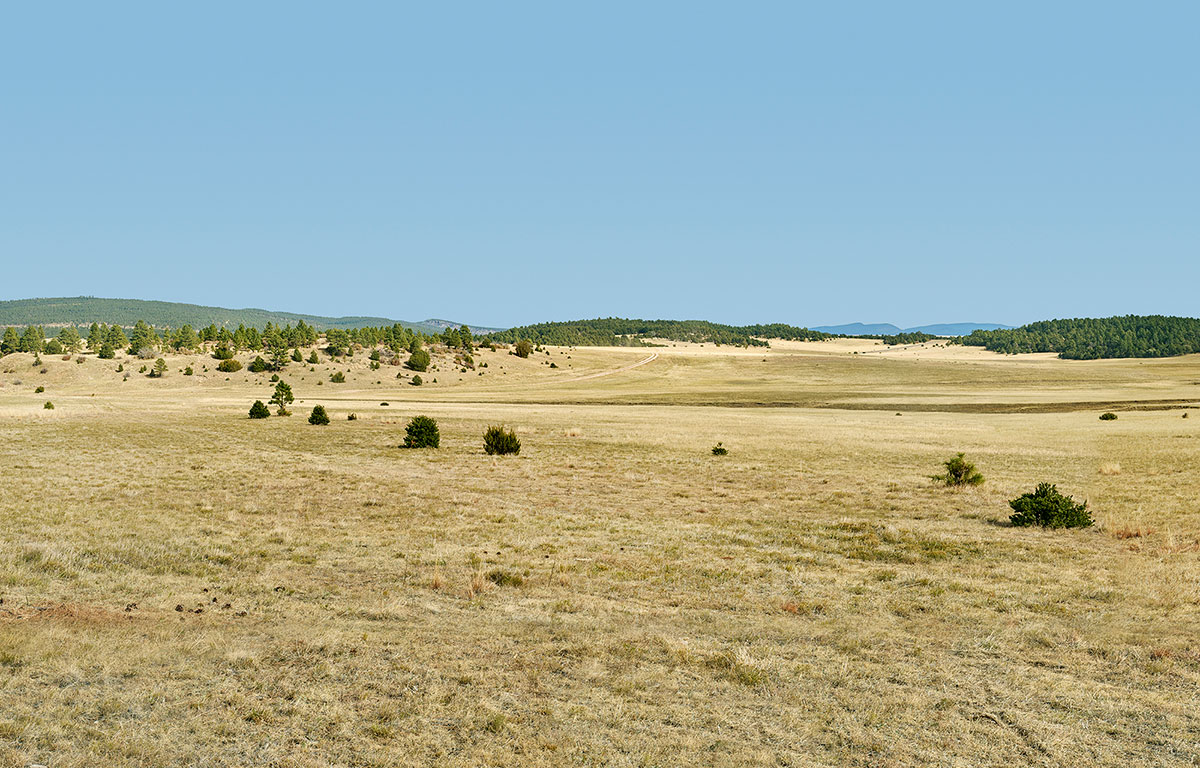 Keywords: Day daytime second 2nd floor FL view of desert landscape green trees pasture shrubs distant mountain mountains blue sky dirt roadwith ranch like grounds in New Mexico