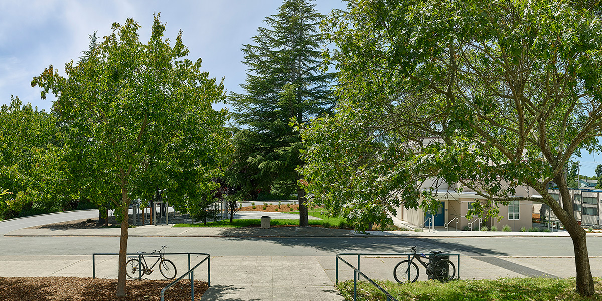Keywords: day daytime school trees green grass front blue sky bicycles