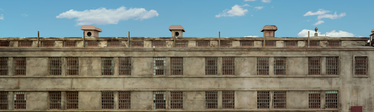 Keywords: industrial warehouse prison blue sky white clouds third floor windows bars search lights santa fe new mexico mexico state penitentiary