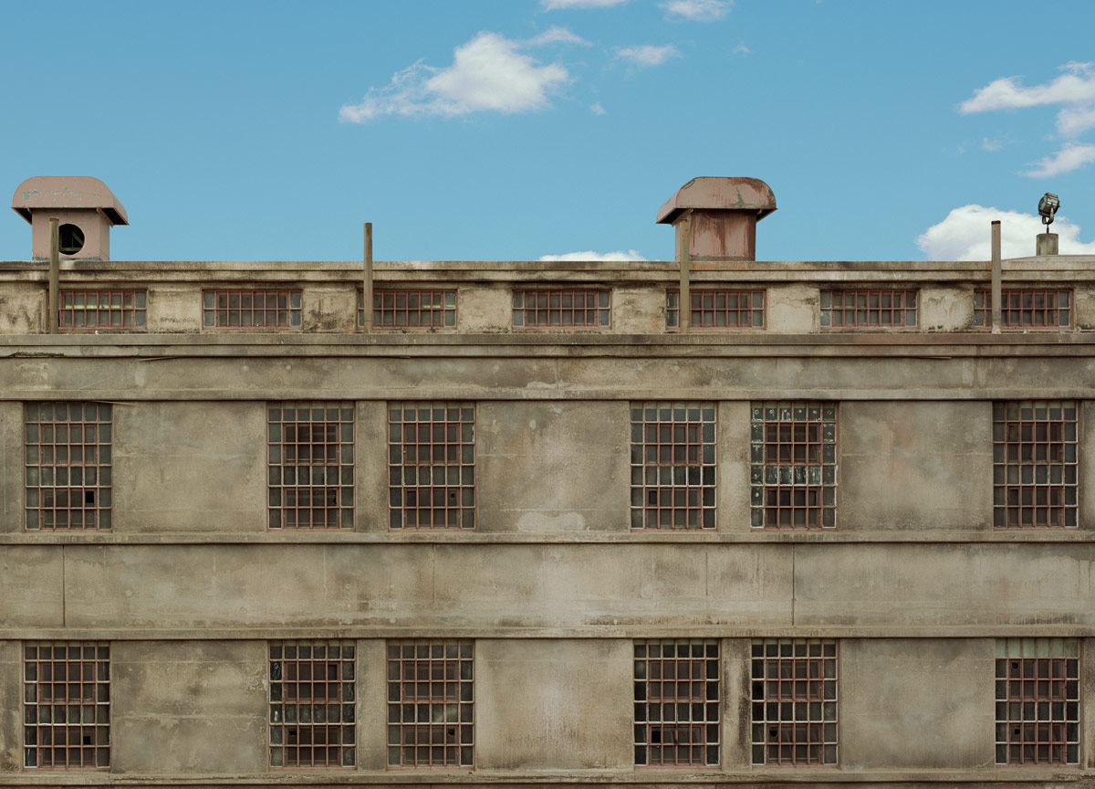 Keywords: industrial warehouse prison blue sky white clouds third floor windows bars search lights santa fe new mexico mexico state penitentiary