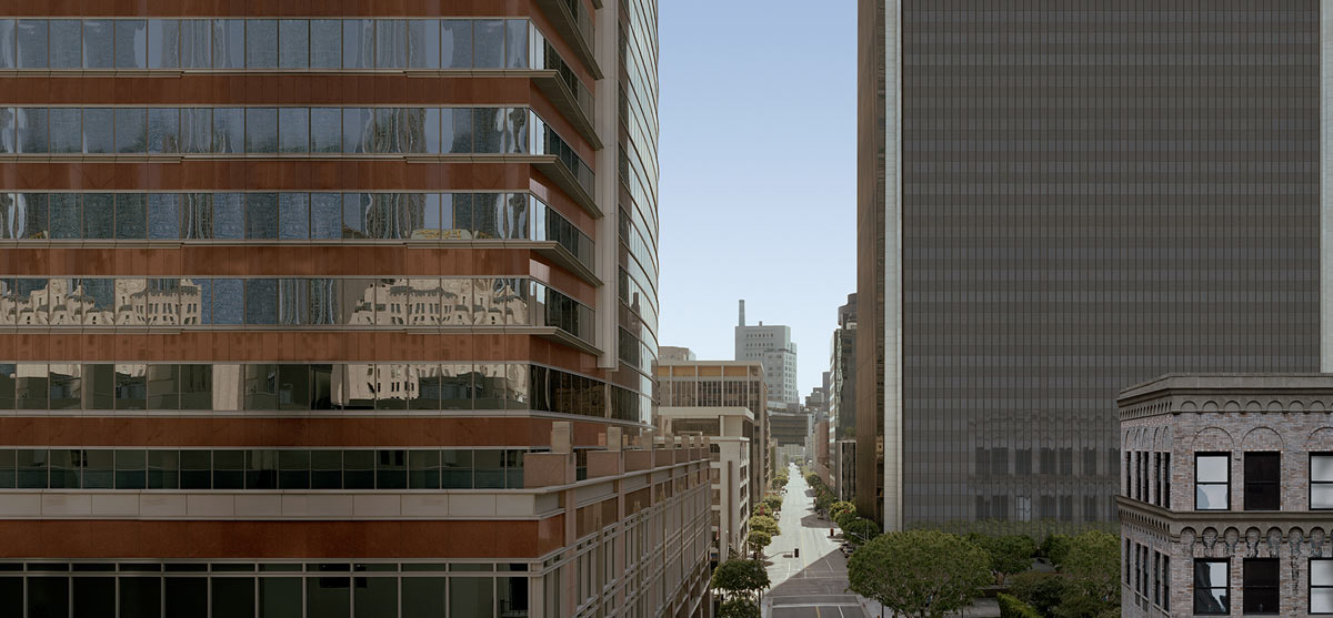 LOS ANGELES CALIFORNIA CITY SKYLINE WITH VIEW OF DISTANT MODERN OFFICE TOWER BUILDINGS WITH PALM TREES AND BLUE SKY